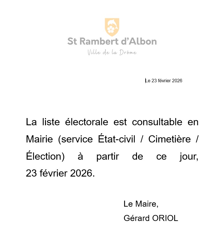 Elections 19 février 2026 – Réunion Commission de contrôle des listes électorales Informations élections municipales 2026 : Télécharger le document ARRETE PREFECTORAL 26-2026-01-14-00003 – fixant date et lieux dépôt candidaturesTélécharger Décret de convocation Télécharger AP-Implantation bureaux de vote 2026Télécharger IMPLANTATION DES EMPLACEMENTS D’AFFICHAGE REGLEMENTAIRES 2026