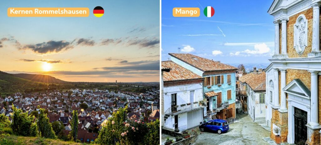 L’une fait partie de la banlieue de Stuttgart, capitale automobile en Allemagne (Mercedes, BMW…) ; l’autre est placée au cœur d’un magnifique vignoble italien, point fort d’une agriculture qui compte aussi quelques haut-lieux de production de la fameuse noisette italienne (célèbre pour sa pâte à tartiner, sans oublier non loin de là la truffe blanche d’Alba…)